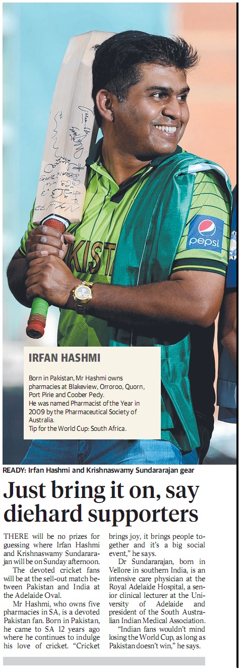 THERE will be no prizes for guessing where Irfan Hashmi and Krishnaswamy Sundararajan will be on Sunday afternoon. The devoted cricket fans will be at the sell-out match between Pakistan and India at the Adelaide Oval. Mr Hashmi, who owns five pharmacies in SA, is a devoted Pakistan fan. Born in Pakistan, he came to SA 12 years ago where he continues to indulge his love of cricket. “Cricket brings joy, it brings people together and it’s a big social event,” he says. Dr Sundararajan, born in Vellore in southern India, is an intensive care physician at the Royal Adelaide Hospital, a senior clinical lecturer at the University of Adelaide and president of the South Australian Indian Medical Association. “Indian fans wouldn’t mind losing the World Cup, as long as Pakistan doesn’t win,” he says.